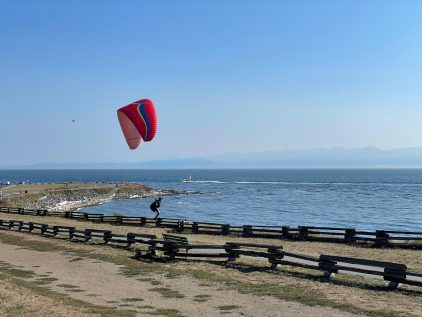 Die wohl schönste Radstrecke der Tour beginnt an der Dallas Road. Der Radweg verläuft direkt an der Küste entlang, vorbei am Kreuzfahrtterminal. Hier öffnen sich weite Blicke auf das Meer: Paraglider starten direkt vom Weg, Surfer spielen in den Wellen. An der Dallas Road liegt auch der Mile Zero des Trans-Canada Highway, der sich von hier bis zum Atlantik zieht – ein symbolischer Punkt für ganz Kanada.
